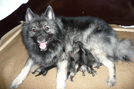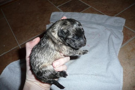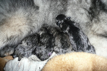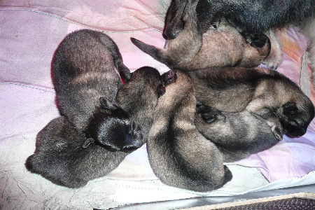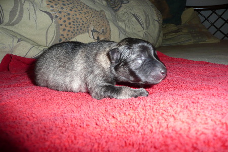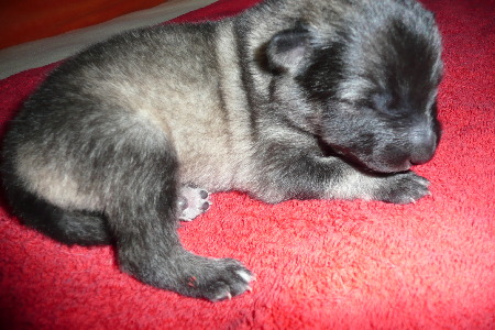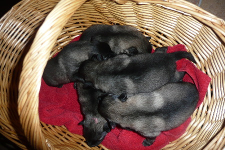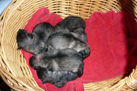 Der rote Punkt auf dem Nacken des einen Welpen, dient nur zur Unterscheidung, jeder der Welpen ist so gekennzeichnet.